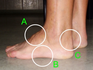 - a láb hosszboltozata (belső (D) és külső (B)) betegesen magasan ívelt,